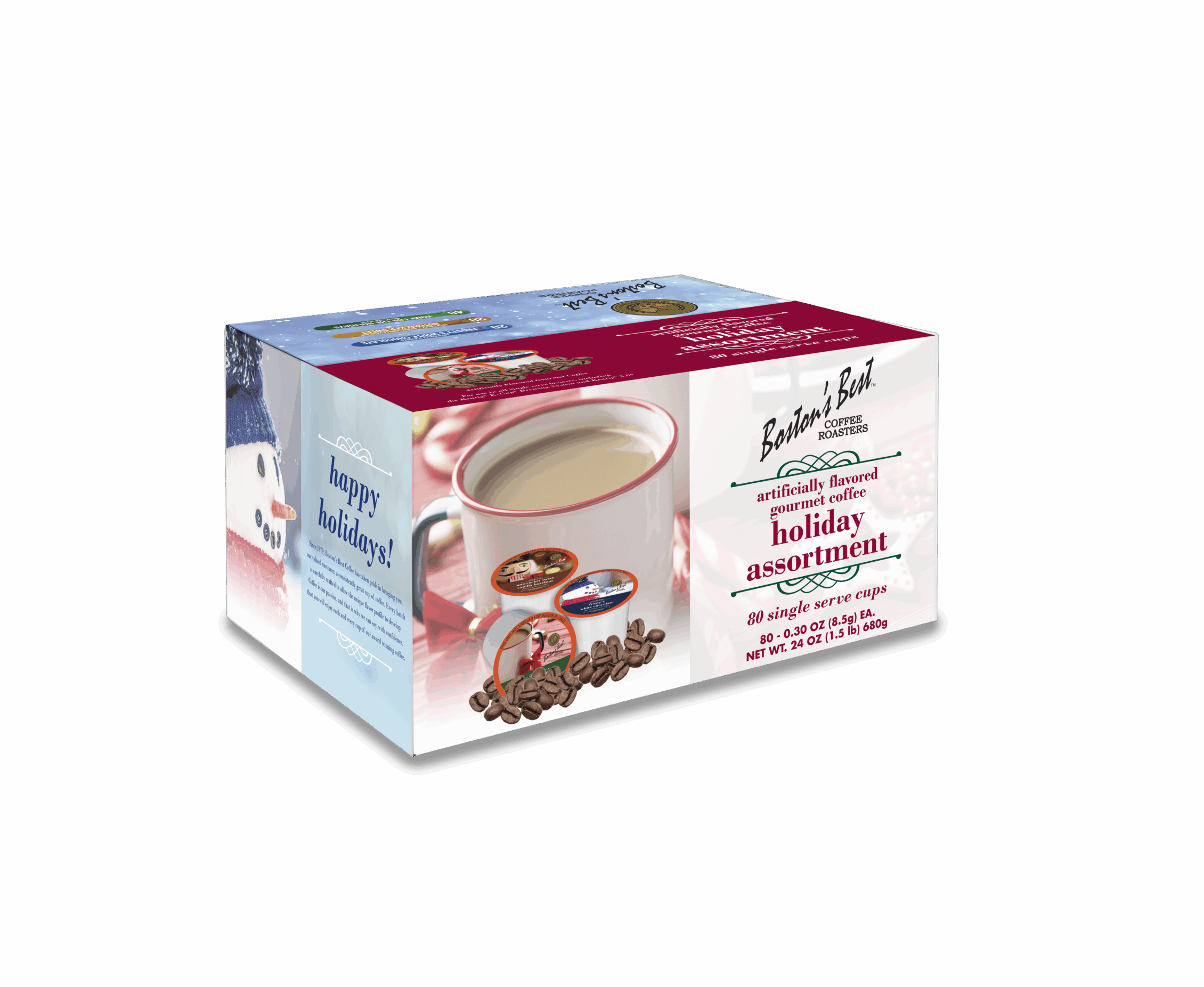 Happy Holidays! This 80 count box includes 20 single serve cups each of Frosty’s White Chocolate flavored and Nutcracker Sweet Vanilla Hazelnut flavored, along with 40 cups of Home For The Holidays Donut Shop Blend. Flavored coffees are artificially flavored.